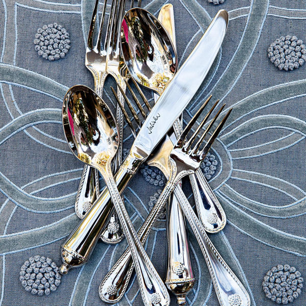 Juliska’s flatware is made of the highest quality 18/10 stainless steel. Our flatware is dishwasher safe unless otherwise noted. To care for your stainless-steel flatware, use a mild, non-abrasive cleanser that does not contain citrus, chlorine, alcohol or perfume. To keep your stainless steel looking its best, avoid prolonged contact with tea, coffee, vinegar and salt which can stain, pit and erode your silverware. When dishwashing your flatware, we recommend loading forks and spoons with their handles down, tines and bowls up. Knives should be placed in a separate basket with sharp ends down to prevent unwanted contact with other flatware. Hot air drying increases the chances of discoloration and corrosion. Dry flatware immediately after washing with a soft towel.Care—Stainless Steel & Stainless Steel with Gold Accents— Dishwasher safe. Avoid cleaners that may contain citrus.