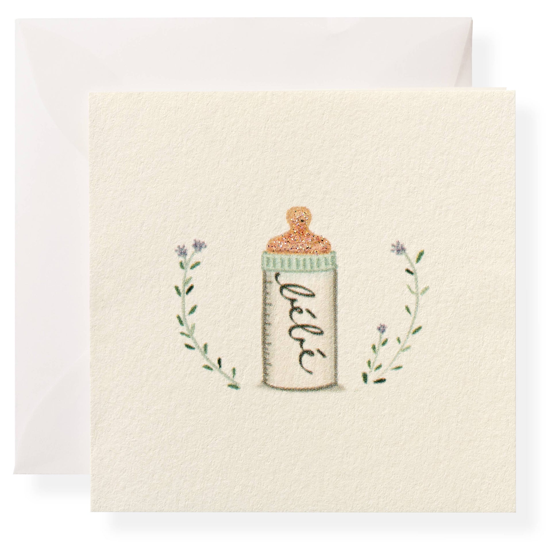 Our Bottle Gift Enclosure is printed and hand-glittered in Memphis, TN. Hand crafted artwork, full color ink printed on natural white paper, hand-glittered, and paired with a vellum envelope. Book-folded enclosure card, blank on the inside.