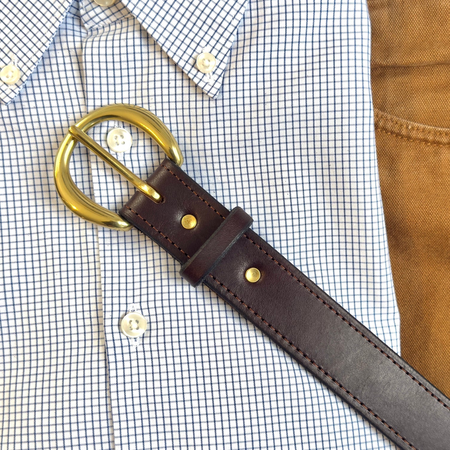 - Brass buckle secured by brass rivets