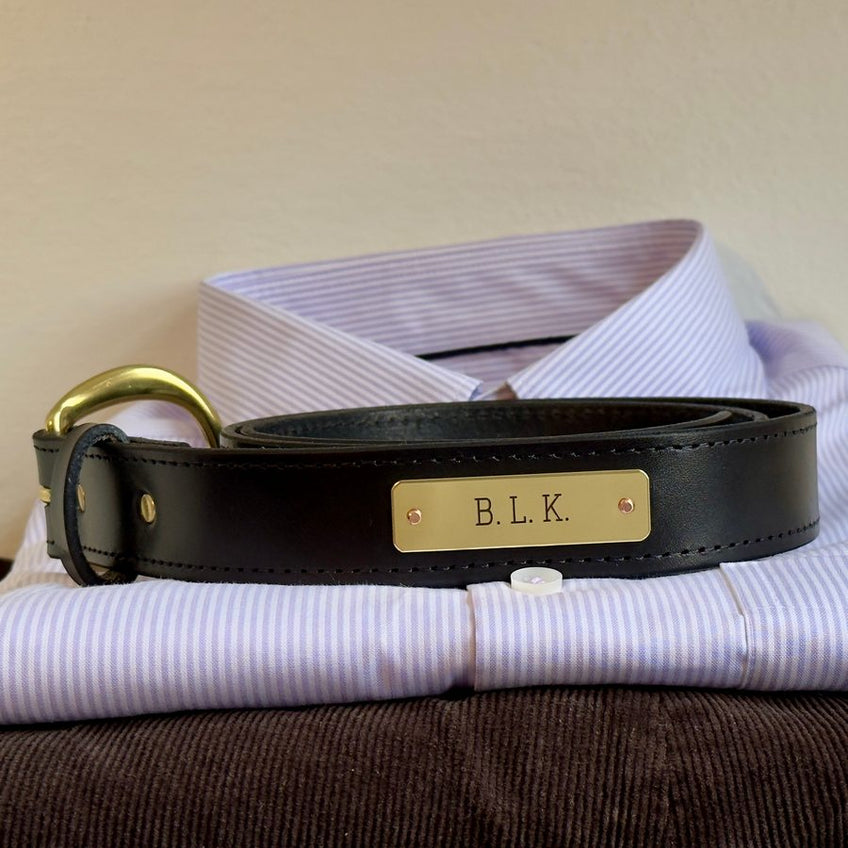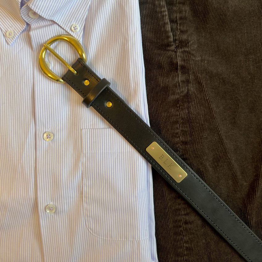 - Custom brass plate mounted on copper rivets and round buckle for old school Americana flare and southern charm.