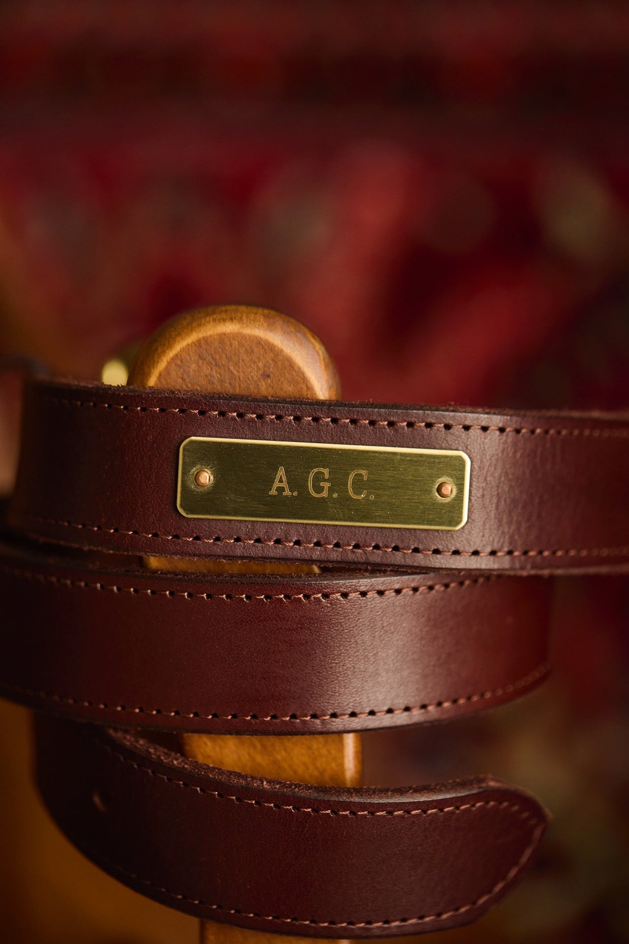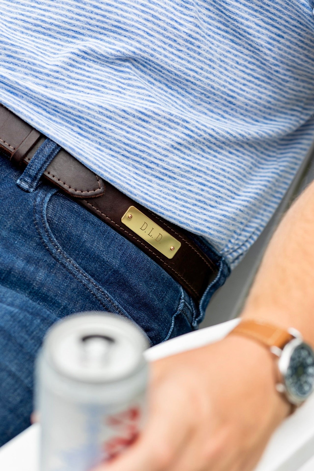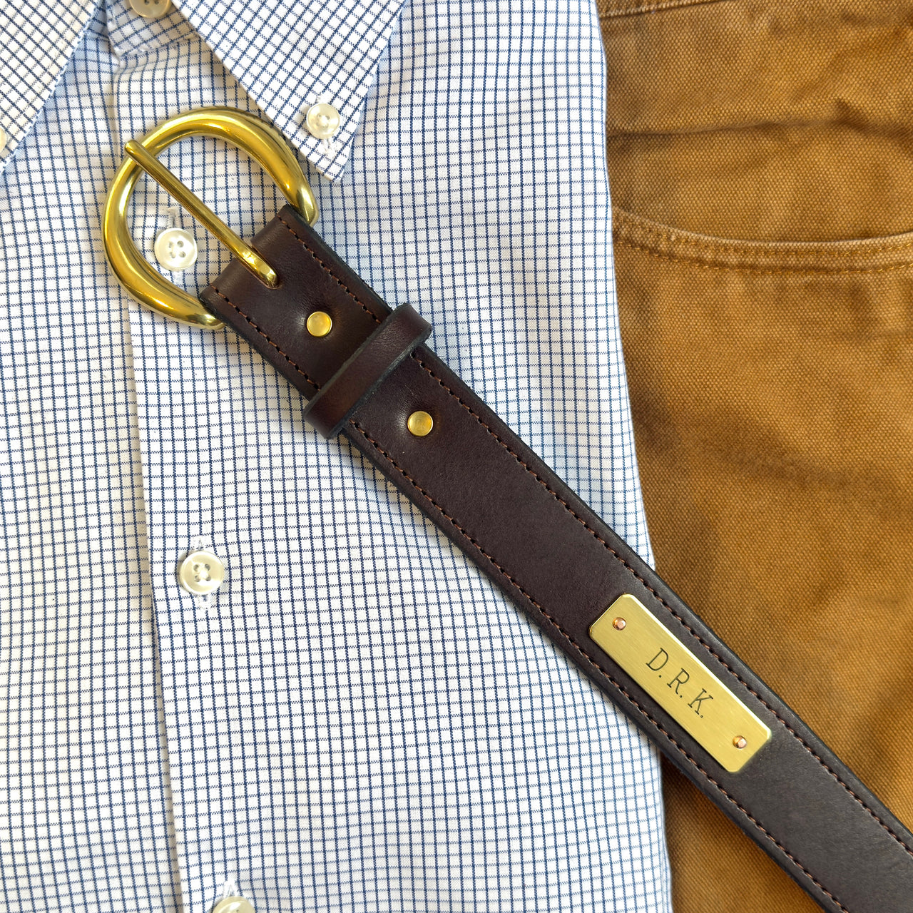- Custom brass plate mounted on copper rivets and round buckle for old school Americana flare and southern charm.