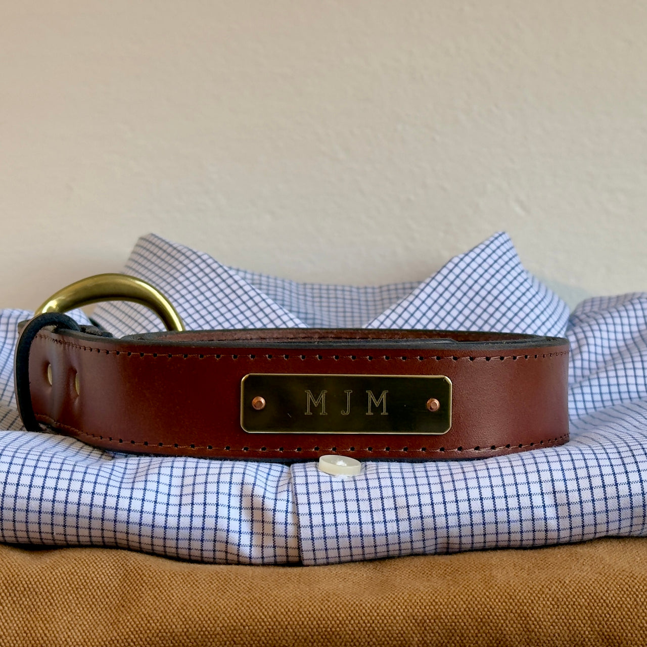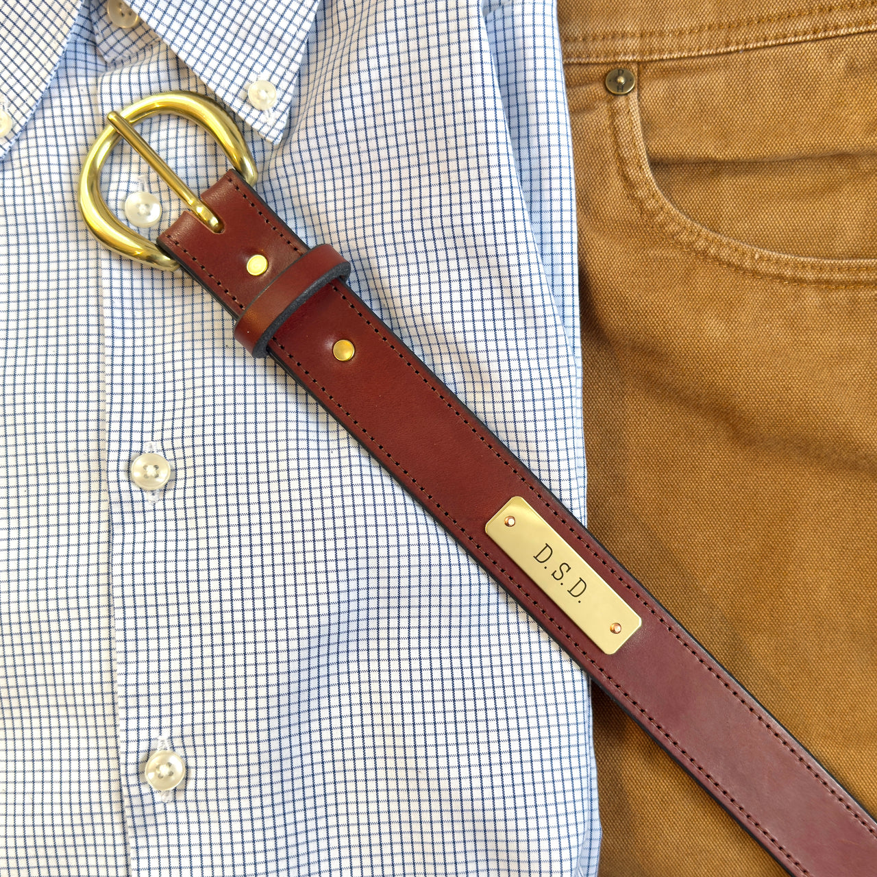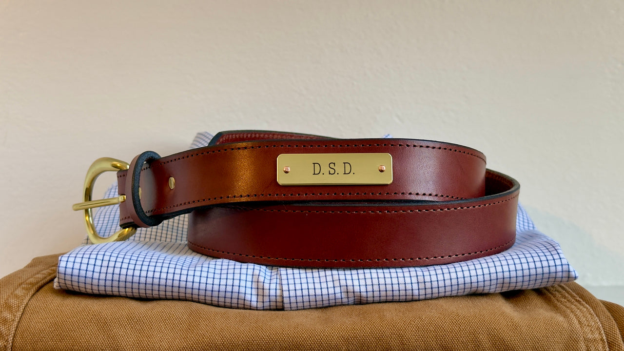 - Custom brass plate mounted on copper rivets and round buckle for old school Americana flare and southern charm.