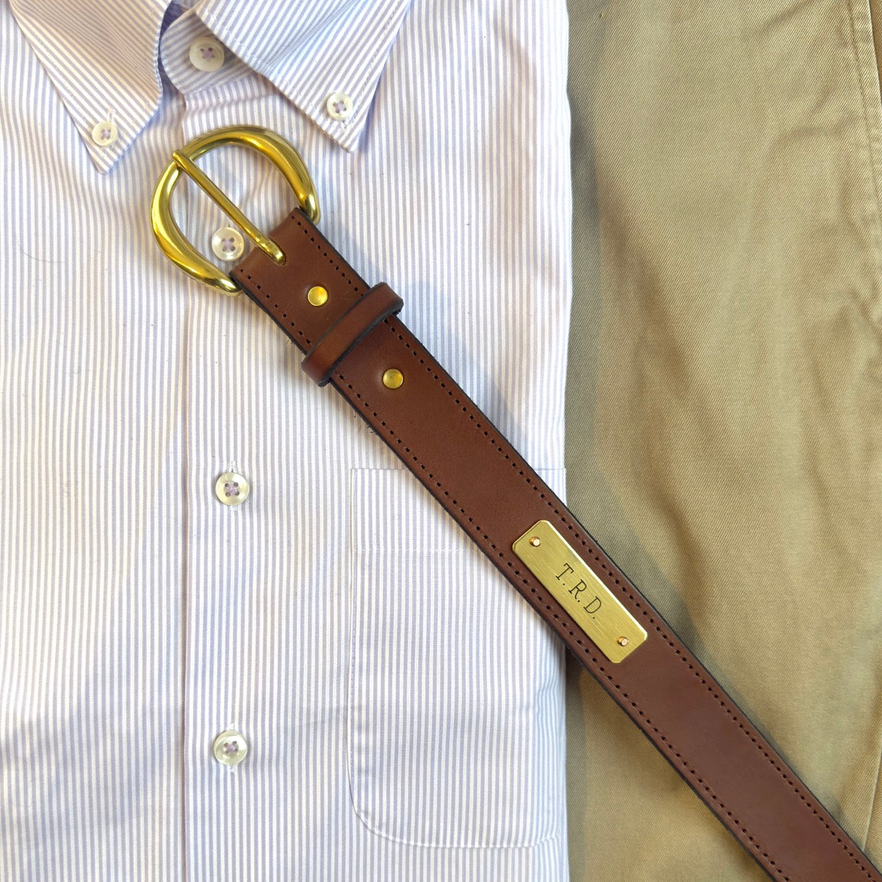 - Custom brass plate mounted on copper rivets and round buckle for old school Americana flare and southern charm.
