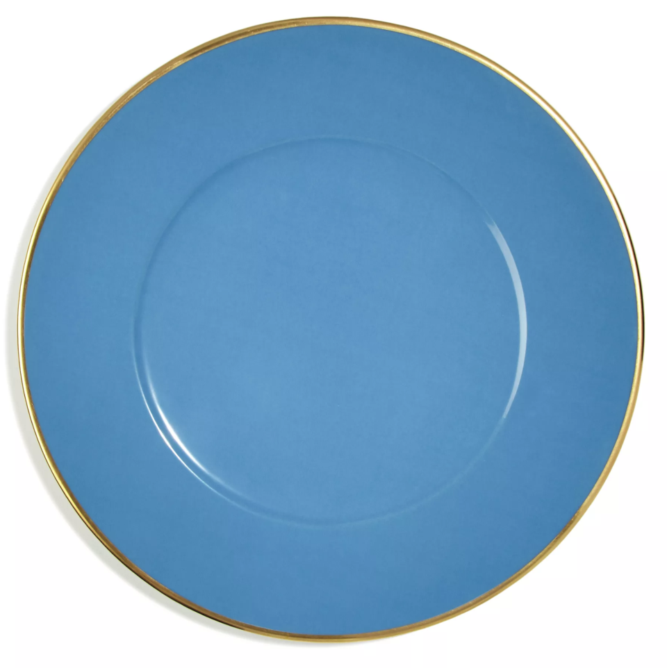 Blue colored charger plate with gold border designed by Anna Weatherly.