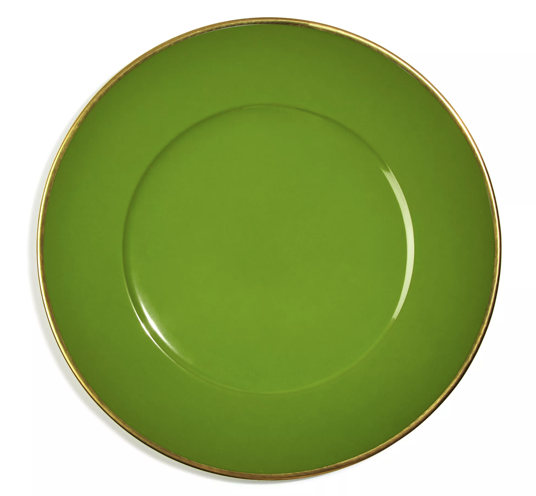 Green colored charger plate with gold border designed by Anna Weatherly.