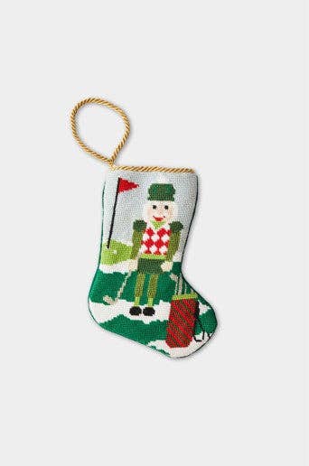 Bauble Stockings are a family tradition, where the final gift of Christmas, or a clue to it, is found in your Bauble Stocking. It isn’t the most expensive gift, but it is the most thoughtful, and always makes you feel so loved. We’ve heard many uses for your Bauble Stocking. Kids searching the house on scavenger hunts, newlyweds taking turns planning a surprise trip each year, and grandparents replacing white envelopes with something that will become a lifelong treasure. A favorite is giving a Bauble Stocking to a mom- the task of working with dad to pick out this special gift for her each year is a memory that will last a lifetime. Hand-stitched needlepoint with cotton threads and velvet backing. 6" long, 4.25" wide