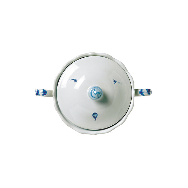 From our Country Estate Collection - A festive garden tent with whimsical kites flying and a view of the Main House sets the ideal scene for a tea party amid the verdure. Details charm to the tiniest detail - even the lid to this double-handled pot is sprinkled with illustrations of a hot-air balloon, a kite, and a butterfly.
