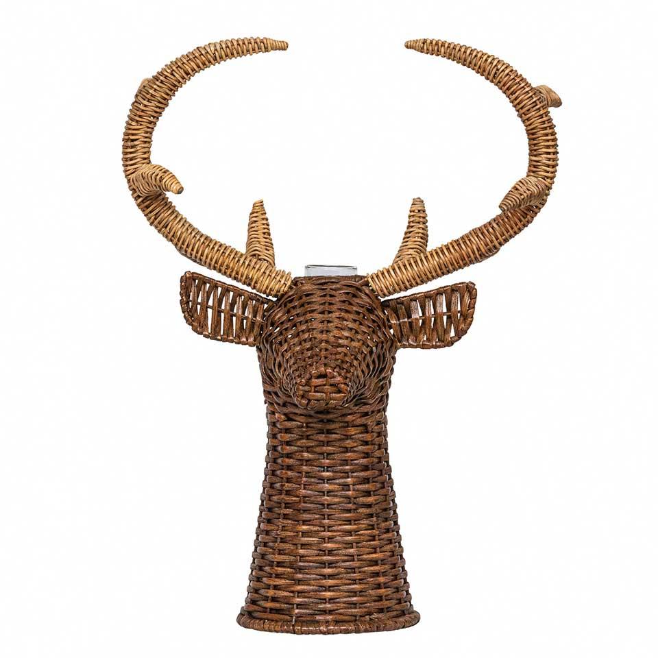 A magnificent display of woodland wonder for Fall decorating, our stately stag brings natural drama and delight to your entryway, mantelpiece, buffet, or dining table. Hand-made of beautifully woven abaca, wicker and rattan, with a clear glass vase nestled within to house whatever autumnal arrangements you dream up.