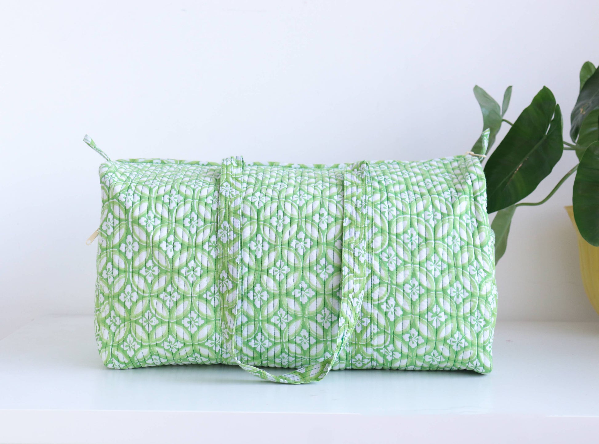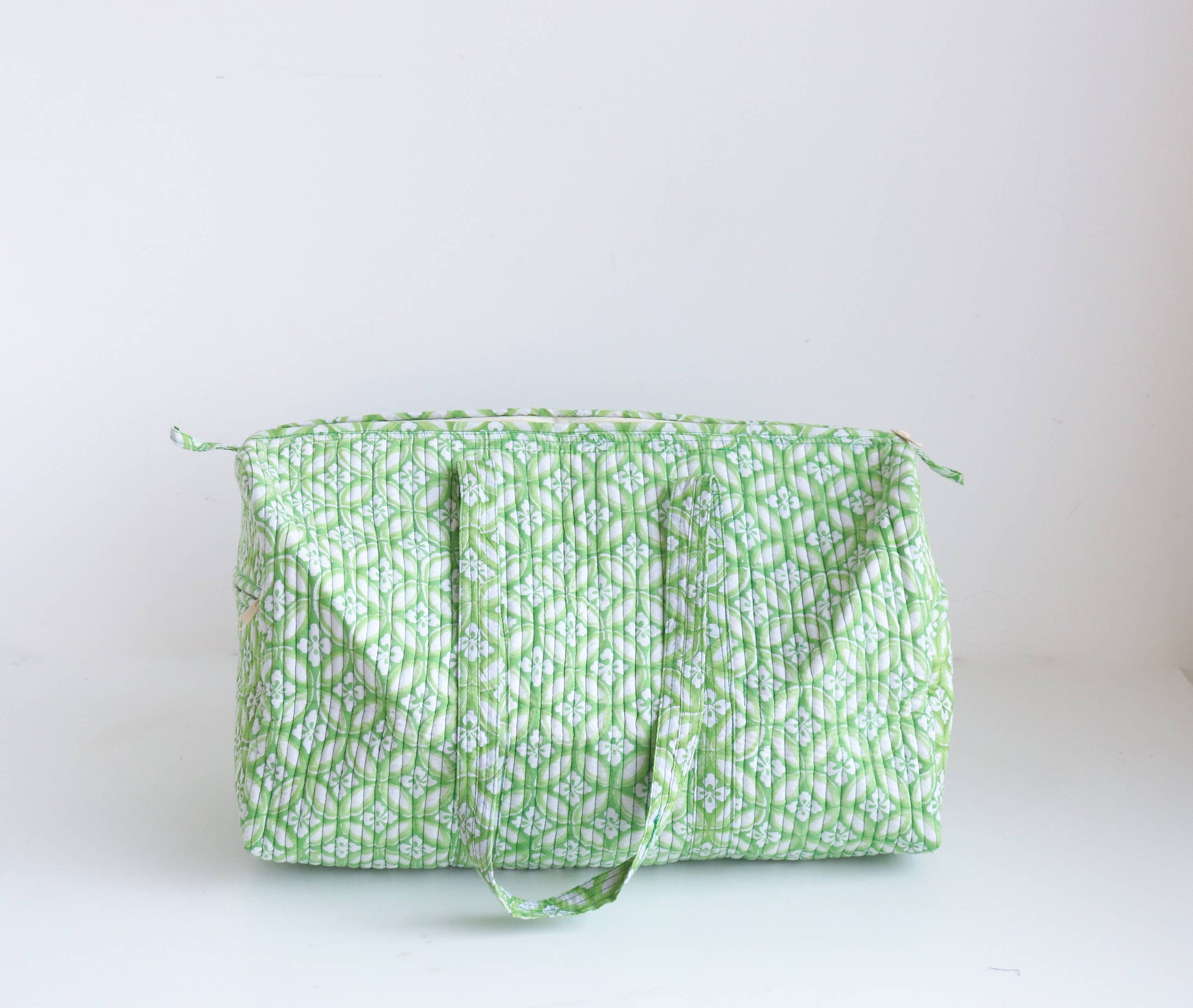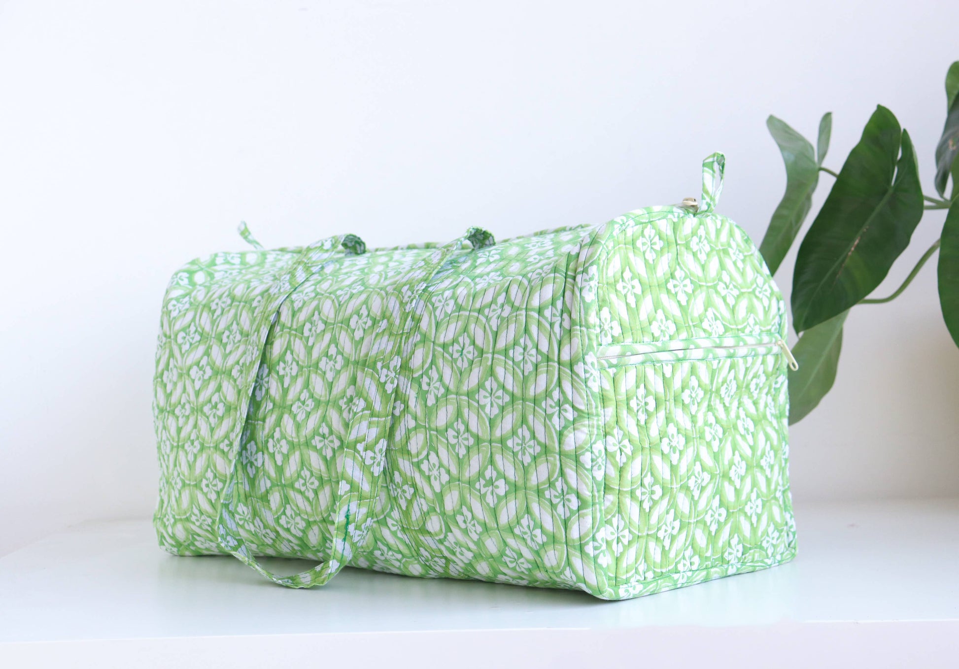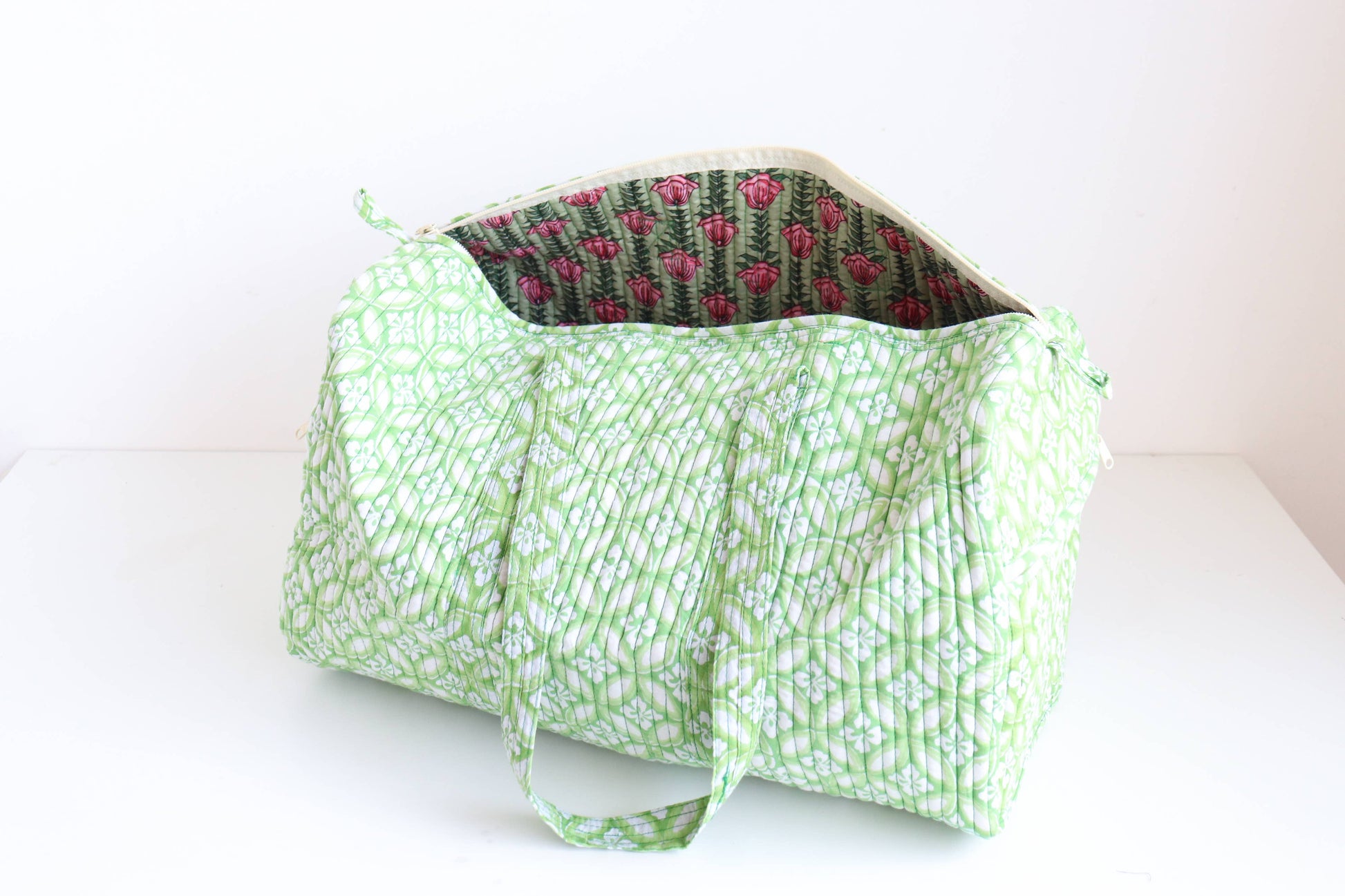This bag features stunning block print fabric, both inside and out, ensuring an artisanal touch to your journey. Its quilted construction, with a layer of foam insert, ensures durability without compromising on style. The playful zipper and convenient loops add to its functionality and flair.