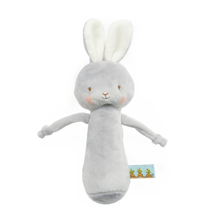 Friendly Chime Bunny is made of soft gray velour with adorably perky bunny ears and hand-embroidered details for its too cute bunny face, with pinked cheery cheeks, and soft dangling arms for chewing and soothing.