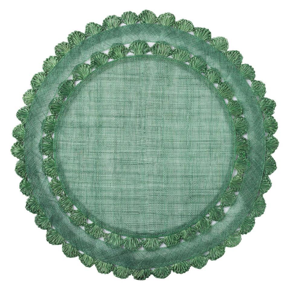 Natural fibers are woven in a rich green hue and embellished by a ruffled trim to create a frame for table settings that is both relaxed and elegant.