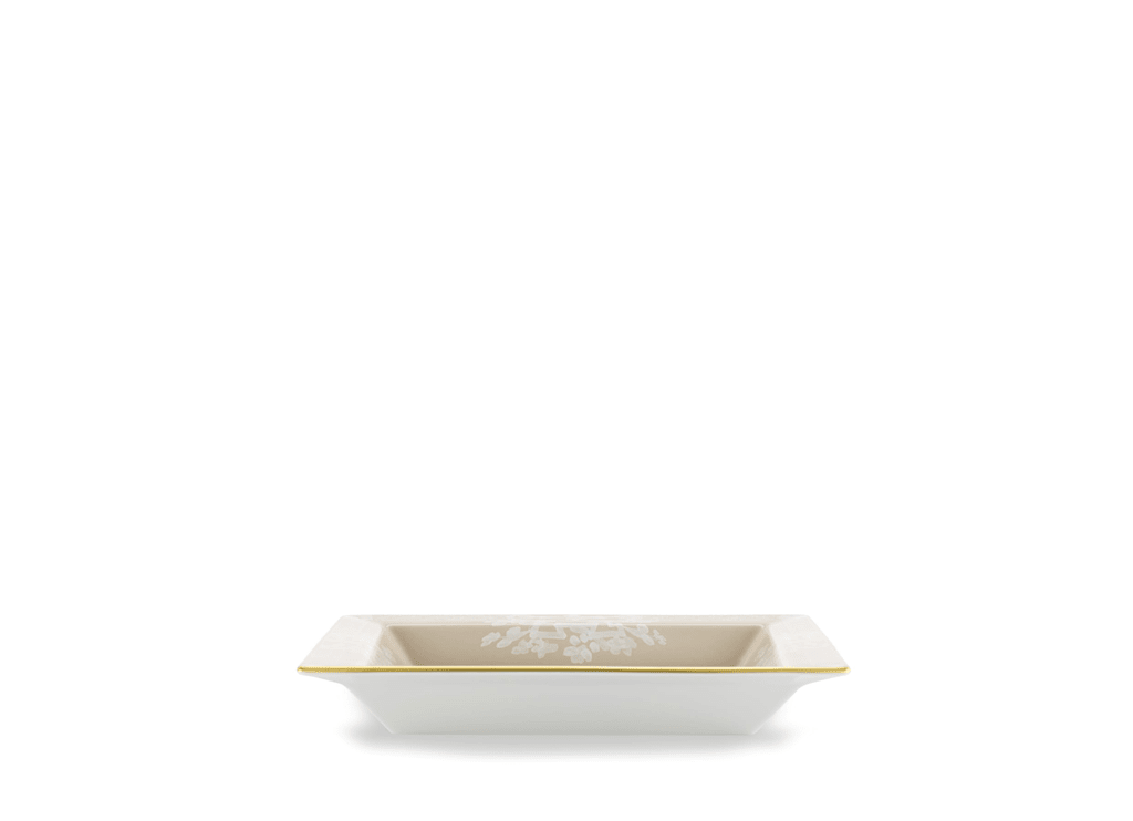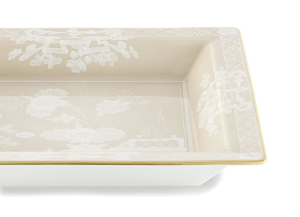 With its unobtrusive yet refined presence, the large design porcelain change tray from the Oriente Italiano Meringa collection embellishes any space with versatility and elegance. The sought-after Meringa beige hue and the delicate gold threading make it a home decor element that fits perfectly in both classic and modern settings.