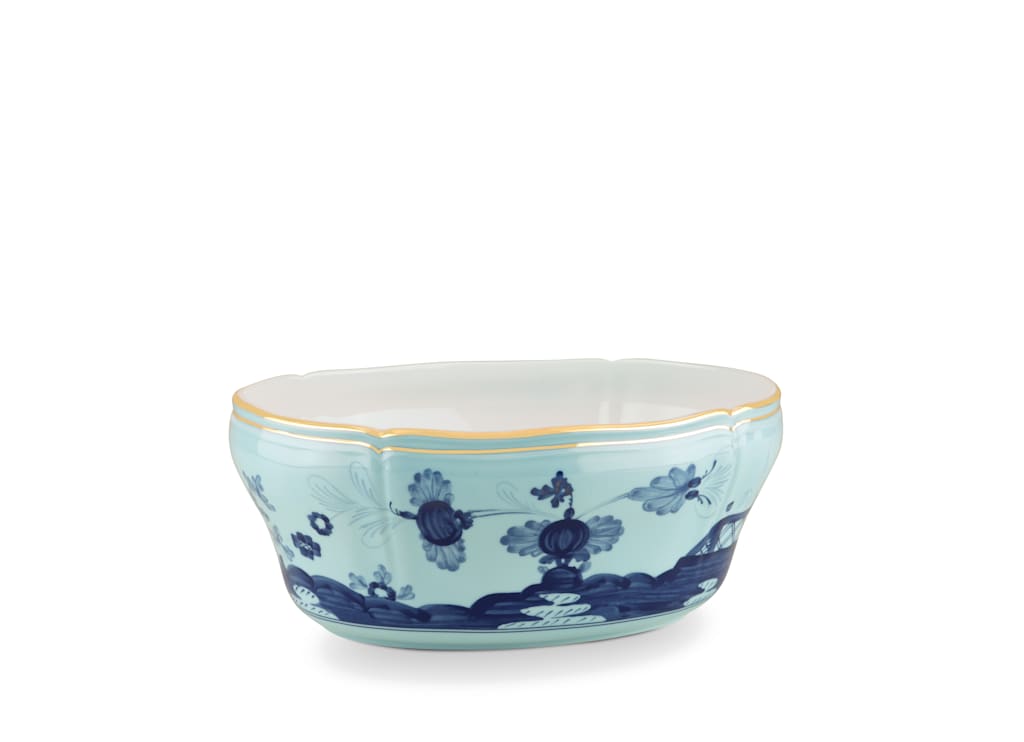 It is distinguished by a blue decoration that evokes the famous "carnation" floral motif contrasting on porcelain decorated in iris blue. Gold threading frames the design and follows the lines of the iconic and essential Antico Doccia shape. Oriente Italiano is a refined and colorful collection of porcelain for the table, tea, coffee and home accessories, in different color variations that define every moment at the table in the unmistakable style of Ginori 1735.