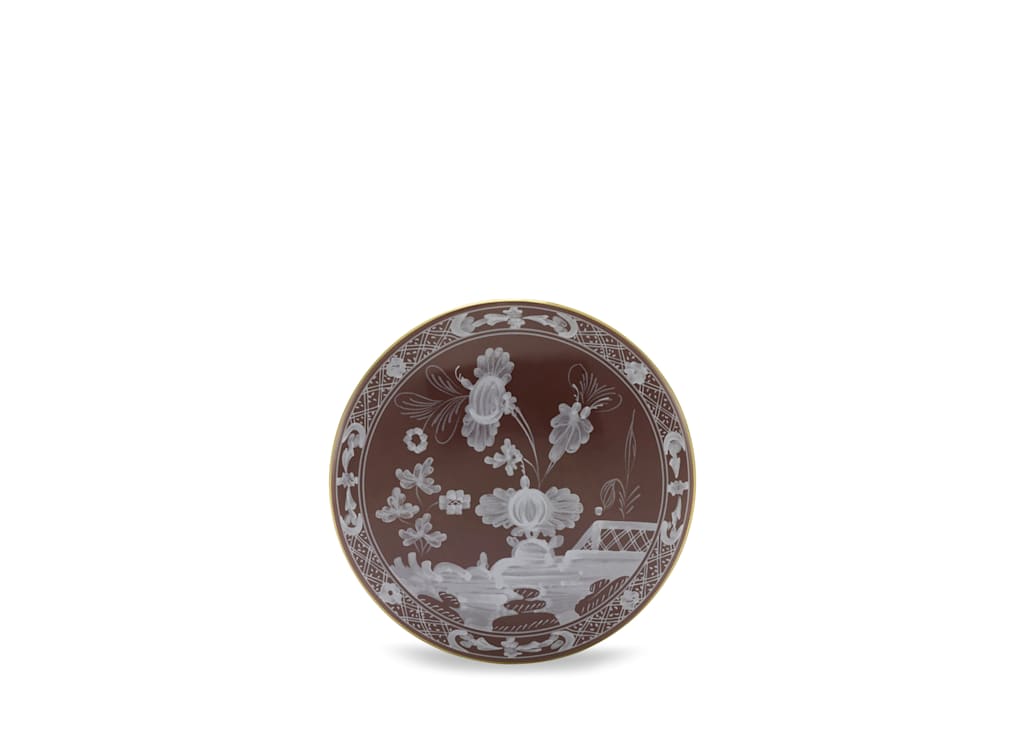 The warm and enveloping Castagna brown hue is embellished with white patterns and gold threading in this porcelain trinket box with a refined design.