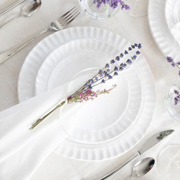 Pietra Serena, meaning serene stone, represents the simplistic beauty of the handpressed design found on the Pietra Serena Dinner Plate.