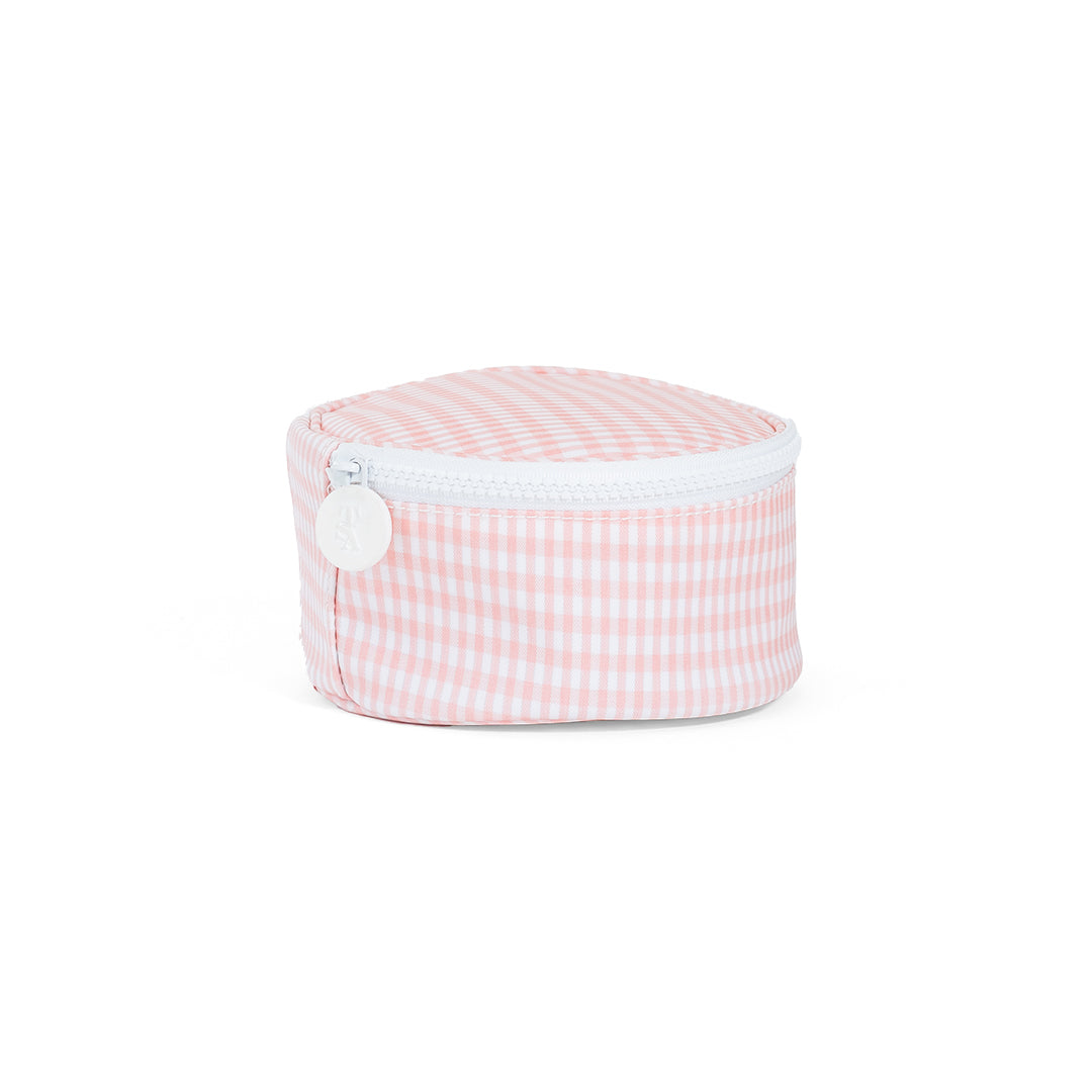 Our Roundup is super lightweight and a perfect place to store your bits and baubles. It has elasticized compartments around the outer edge with a roomy middle compartment for bulkier pieces, like watches, bracelets and hair ties. This case can just as easily be used as a general catch-all for things like keys or earbuds. As a bonus, it looks pretty enough to leave out on your dresser or desk when you're not traveling.