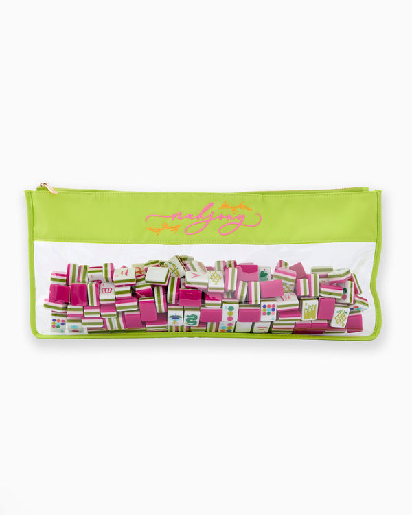 Bright, bold, and full of personality, the Yellow Script Zippered Bag is here to add a splash of sunshine to your mahjong game! In a cheerful lemon-lime tone with vibrant pink and orange script embroidery, this bag exudes fun, energy, and style. Designed for both functionality and flair, it features a spacious interior, a secure zipper closure, and a clear bottom section to display your tiles in style. Perfect for anyone who loves to mix color with a little bit of playfulness!